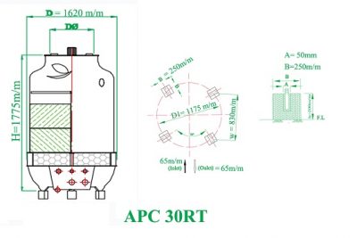 Tháp giải nhiệt nước 30RT là thiết bị giải nhiệt nước có khả năng giải nhiệt : 117000 Kcalo/giờ, công suất 390 lít/ phút hay 23.4 m3/h (23.4 mét khối một giờ), nên sử dụng cho các trường hợp như 20m3/h, hoặc 18m3/h. Đường ống vào / ra : 65mm, Tháp làm mát nước 30RT có chiều rộng 1620mm, chiều cao 1775mm, sử dụng động cơ 3/4HP, trọng lượng khô/hoạt động : 110/500kg