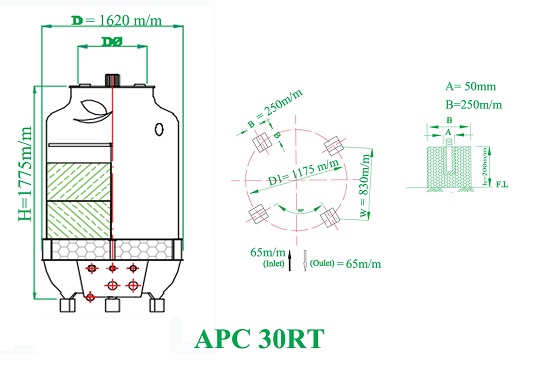 Tháp giải nhiệt công nghiệp 30RT được thiết kế dạng tròn sử dụng cho các phân xưởng sản xuất vừa và nhỏ. Vỏ , thân tháp làm từ chất liệu Composite rất gọn, nhẹ có khả năng chống thấm nước tốt, chịu được mọi tác động tiêu cực từ môi trường. Tấm tản nhiệt là từ chất liệu PVC chất liệu chuyên dụng cho quá trình giải nhiệt nước